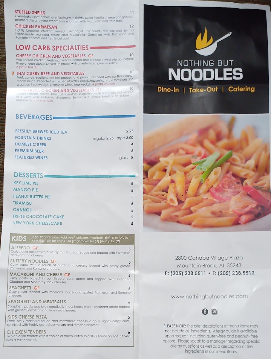 Welcome to Nothing But Noodles, a delightful fusion restaurant located in the heart of Mountain Brook, Alabama. Specializing in tantalizing noodle dishes, the restaurant offers a diverse menu featuring flavors from around the world, including standout items like Shanghai noodles and Pad Thai. Customers rave about the generous portions and attentive service, with staff like Dee ensuring a memorable dining experience. While the ambiance could use some improvement, the quality and variety of flavorful dishes make it a must-visit for noodle enthusiasts. With a calm and inviting atmosphere, Nothing But Noodles is sure to leave you craving more after your first bite!